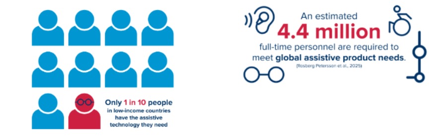 Lack of trained workforce is a large factor affecting access to assistive technology. The Global Report on AT in 2021 found that globally only one in ten countries had adequate and trained resources for any of the functional domains, and 14 per cent had no relevant training and education. In low- and middle-income countries, the challenge is even greater; 93 per cent have fewer than one audiologist per million, optometrists operate at densities of less than 0.08 per 100k contrary to the recommended 1 per 50k, and there is usually only one prosthetics and orthotics professional per million, contrary to the suggested minimum of five per million.